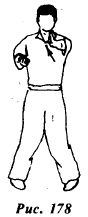 Выпрямляя левую руку в локтевом суставе, нанесите тычковый удар пальцами вперед. Левую руку отведите назад кулаком к груди (рис.178).