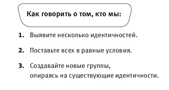 Социальные диалоги – разговоры «Кто мы?» – ведут к более глубокому пониманию и более крепким связям. Мы должны позволить этим дискуссиям стать глубокими, выявить наши множественные идентичности и озвучить общий опыт и убеждения. Разговор «Кто мы?» эффективен не только потому, что нас связывают общие интересы и опыт, но и потому, что позволяет нам поделиться тем, кто мы на самом деле.