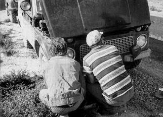 Конечно, по закону опытных работ мы перед выездом должны были дождаться результатов специальных испытаний кузова, которые проводятся на булыжнике заводского трека. Чтобы отправляться в дальнюю дорогу уже с доработанным его вариантом. Увы, времени на это не было, мы рискнули и правильно сделали – удалось выиграть бесценные месяцы. Зафиксировав и засняв на плёнку все трещины, приступили к ремонту. Конечно, вести такую сварку в примитивных условиях небольшой СТО весьма непросто, но за пару дней мы с помощью местных ребят (огромное им спасибо!) всё закончили.