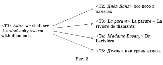 T5: И над вершинами Кавказа Изгнанник рая пролетал: Под ним Казбек, как грань алмаза, Снегами вечными сиял.Таким образом, грань алмаза Лермонтова трансформируется в Granial Maza. В то же время подлинная фраза Чехова «все небо в алмазах» совершенно неожиданно сливается с подражаниями из Мопассана, Флобера и Лермонтова в какой-то особой трехязычной игре слов: