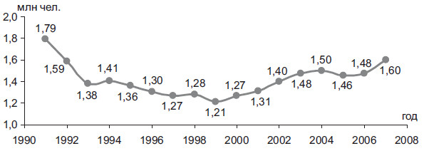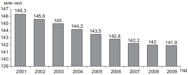 Одной из наиболее резонансных в пропагандистском отношении кампаний последних лет стала борьба против кризиса депопуляции России. Но население России как сокращалось, так и продолжает сокращаться поныне. Страна по-прежнему вымирает. Темпы снижаются, но совершенно очевидно, что кризис, начавшийся в 2008 г. и протекающий в перелиберализованной, демонетизированной, экспортно-сырьевой, асоциальной России тяжелее, чем во всех странах мира, внесет свой печальный вклад. Какое уж тут возрождение? (Рис. 1.1) [6] .