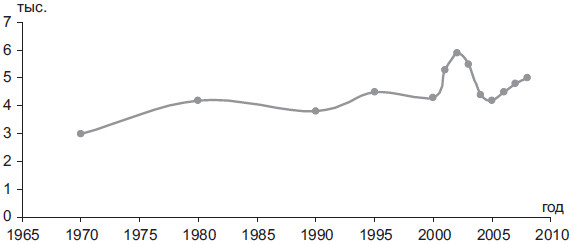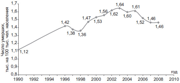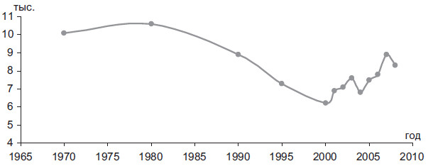 Некоторое снижение показателя смертности за несколько последних лет также является минимальным. Совокупный коэффициент смертности остается выше, чем в 1990-е гг., не говоря уже об уровне, отмечаемом в советское временя (рис. 1.6) [11] .