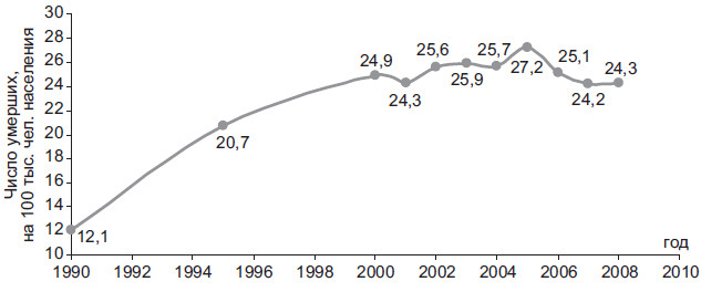 в России по классу инфекционных и паразитарных болезнейРис. 1.8. Смертность в России по классу таких причин, как болезни органов пищеварения