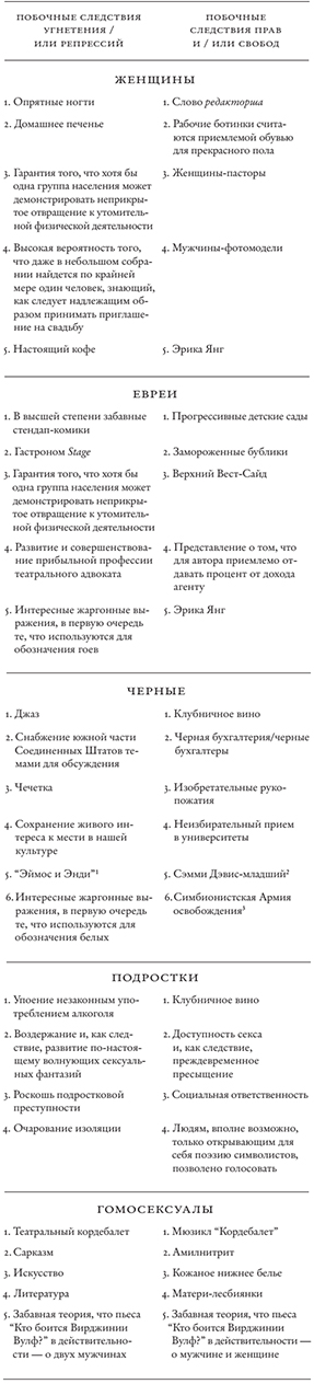Я говорю не только об этикете, поскольку, хотя этикет, несомненно, стоит принимать во внимание, подобающее поведение им далеко не исчерпывается. Оно требует, к примеру, чтобы широкая общественность воздерживалась от запуска трендов, преодоления запретов и развития скрытых талантов. Далее оно требует смириться с тем фактом, что общее благо обычно не такое уж благое и что головокружение от демократии существует. Угнетение и/или репрессии не лишены своего обаяния, а права и/или свободы – своих изъянов. Это ясно показывает таблица, предлагаемая вашему вниманию.