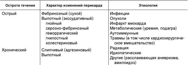 Классификация. Существуют две классификации перикардитов; одна из них является этиологической, вторая — клинико-морфологической (табл. 1.16).