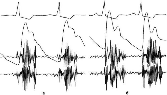 На исходной ФКГ (а) выявляется систолический шум, интенсивность которого существенно увеличилась после вдыхания амилнитрита (б), сфигмограмма после вдыхания амилнитрита имеет типичный для обструктивной гипертрофической кардиомиопатии вид (два пика – «клешня рака»)