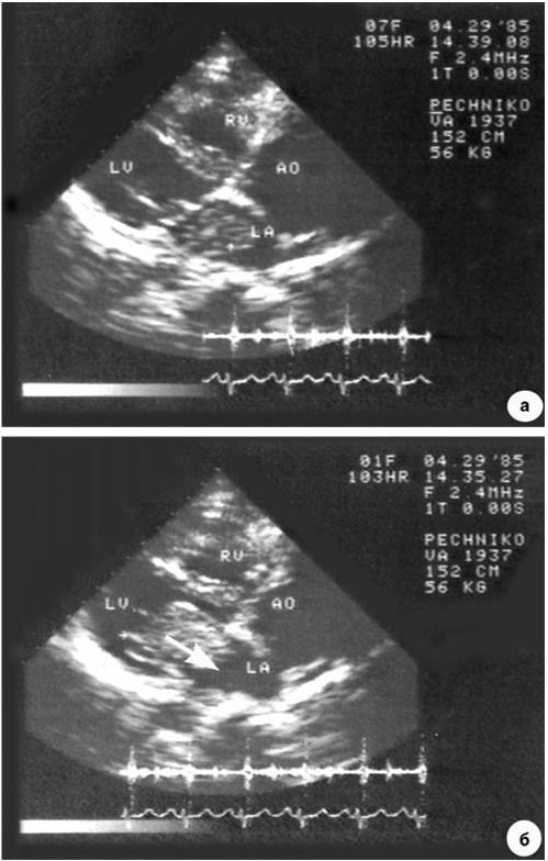 Во время систолы левого желудочка (а) опухоль локализована в левом предсердии, во время диастолы (б) она пролабирует в полость левого желудочка (миксома указана стрелкой)