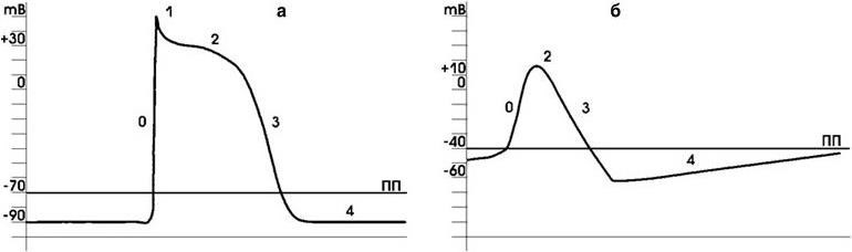 Рис. 1.14. Фазы потенциала действия сократительных кардиомиоцитов («быстрые» клетки – а) и пейсмекеров синусового узла («медленные» клетки – б):
