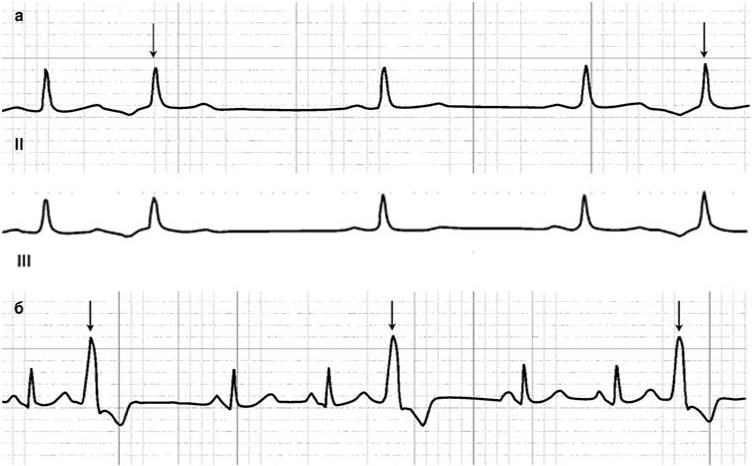 а – нижнепредсердные экстрасистолы; б – желудочковая экстрасистолия по типу тригеминии