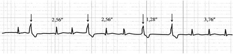 Рис. 1.17. Желудочковая парасистолия. Стрелками указаны парасистолические комплексы. Предэктопические интервалы (интервалы сцепления) разные. Межпарасистолические промежутки кратны 1,28 с