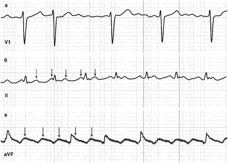 Фибрилляция предсердий проявляется мелкими или крупными разной формы волнами f (fibrillation).