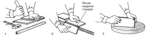 Рис. 25. Подготовка плиток: 1 – резка; 2 – раскалывание (разламывание); 3 – приточка кромок