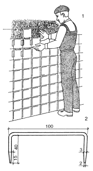 Обрезанные плитки размещают по углам. При несимметричном расположении плиток облицовку начинают с нижнего угла стены. В последнее время широко применяется облицовка с уширенными швами, особенно плитками 3-го сорта, которые имеют отклонения кромок от плоскости до 2 мм. При облицовке с плотным примыканием плитки не всегда будут лежать в одной плоскости. Чтобы сгладить эти дефекты, облицовку выполняют с уширенным швом, ширина которого должна быть не более 3 мм. Кроме того, швы заполненные раствором лучше удерживают плитки. Для соблюдения заданной толщины шва между плитками устанавливают гвозди или скобы (рис. 28), изготовляемые из стальной проволоки толщиной 2–2,5 мм. Длина скобочек должна быть на 2–3 см меньше размера плиток. Чтобы не сдвинуть плитку с места при вытаскивании скобы, концы ее запиливают на конус с 2,5 мм до 1,5 мм.Рис. 28. Облицовка стен с устройством уширенного шва (с применением инвентарной скобы): 1 – облицовка; 2 – скоба