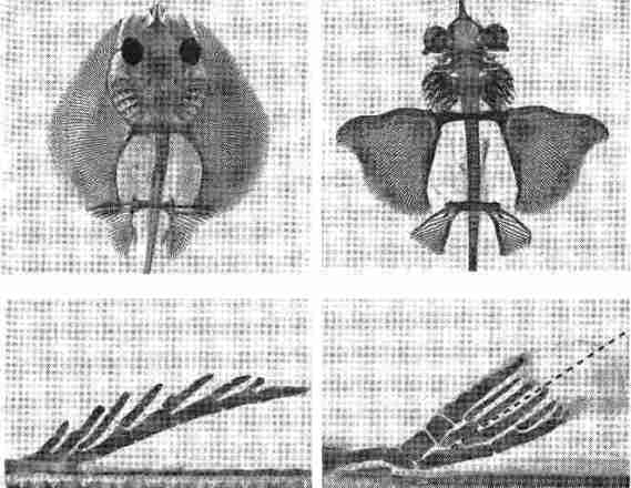 Нормальные плавники (справа) и плавники эмбрионов, которые Рэнди обработал витамином А. Плавники обработанных эмбрионов оказываются зеркально удвоены, совсем как крылья у аналогичным образом обработанных цыплят. Фотографии любезно предоставил Рэндалл Дан (Чикагский университет).