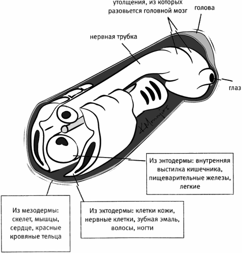 разделены небольшим промежутком — на его месте впоследствии разовьется полость тела. Эта принципиальная схема строения — одна трубка внутри другой — останется с нами на всю жизнь. Внутренняя трубка будет постепенно усложняться: на ней возникнет большое утолщение (желудок), а идущий за ним кишечник удлинится и причудливо изогнется. Внешняя трубка тоже изменится: из нее образуется кожа, на которой вырастут волосы, а форма поверхности в ходе развития конечностей и других частей тела станет намного более сложной. Но в своей основе этот план строения сохранится. Наши тела, может быть, и устроены сложнее, чем были в первые три недели после зачатия, но по сути по-прежнему представляют собой две трубки, одна внутри другой, и все без исключения наши органы развились из трех слоев ткани, обособившихся в течение второй недели после оплодотворения.Названия этих трех важнейших слоев (зародышевых листков) соответствуют их положению: наружный слой называют эктодермой, внутренний — энтодермой, а средний, расположенный между ними, — мезодермой. Из эктодермы образуются наши покровы (то есть кожа) и нервная система. Из энтодермы (внутреннего слоя) развиваются органы пищеварительного тракта и связанные с ним железы.