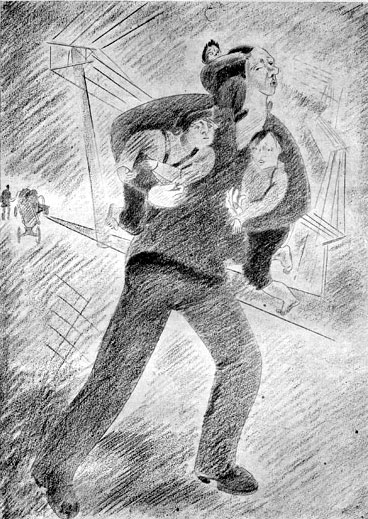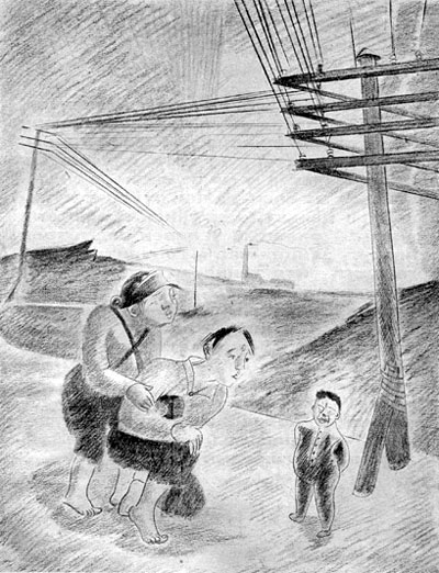 Пошли мы дальше, но маленький человек не может за нами угнаться. Бегом бежит, а все-таки отстает. Тогда мы его взяли за руки. Петька за правую, я за левую. Маленький человек повис у нас на руках, едва ногами земли касается. Пошли мы так дальше. Идем все трое и песенки насвистываем.