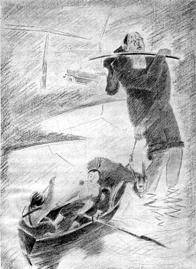 В-ШЕСТЫХ, приехали мы к большому озеру. Глядим, у берега лодка стоит. «Что ж, поедем на лодке?» — говорит Петька. Я с Петькой хорошо в лодке уселся, а вот длинного человека с трудом усадили. Согнулся он весь, сжался, коленки к самому подбородку поднял.