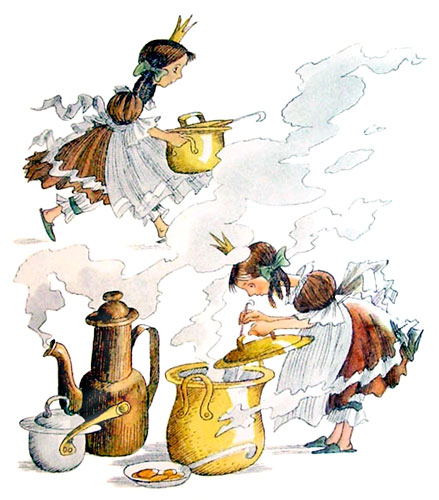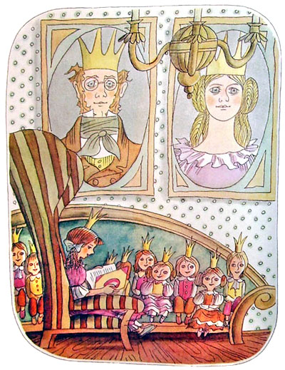 Принцесса Алисия следила, чтобы семнадцать других принцев-принцессочек не ссорились; она их одевала, она их раздевала, она играла с малышом, и кипятила кастрюлю, и грела суп, и чистила плиту, и вовремя наливала лекарство, и ухаживала за королевой, и делала всё, что только могла, и хлопотала, хлопотала, хлопотала так, что из сил можно выбиться, потому что у них во дворце слуг было мало из-за того, что, во-первых, король был небогатый, и, во-вторых, прибавки у них в правлении всё не предвиделось и не предвиделось, и, в-третьих, до дня получки было ещё так далеко, что этот день еле-еле можно было разглядеть отсюда, как малюсенькую звёздочку на небе.