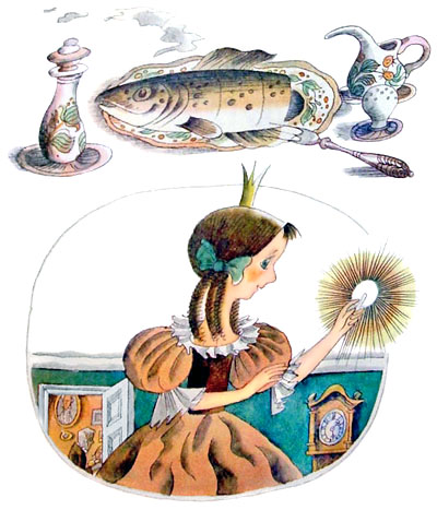 — Впредь ведите себя как следует, — сказала Великая фея Синемора, — и так не поступайте. Когда прекрасная принцесса Алисия изволит отведать сёмги — а мне думается, она изволит, — вы обнаружите, что у неё на тарелке осталась косточка. Скажите ей, чтобы она сушила, чистила и тёрла эту косточку, пока та не заблестит, как перламутр. И пусть она бережёт косточку, потому что это мой подарок.