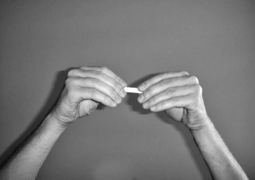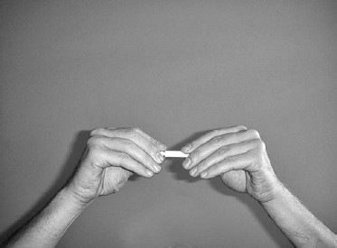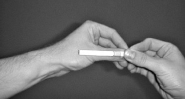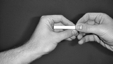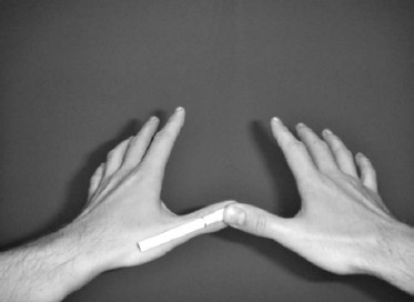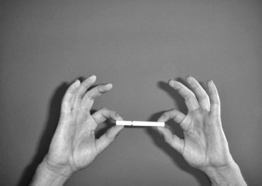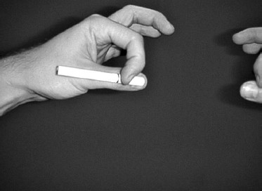 Все очень просто. Мы смотрим с твоей стороны. Ты засовываешь сигарету не внутрь, а снаружи пальца. Потом прижимаешь ее пальцем и показываешь. Потом, чтобы разомкнуть пальцы, ты опять закрываешь руки и прижимаешь сигарету другим пальцем.