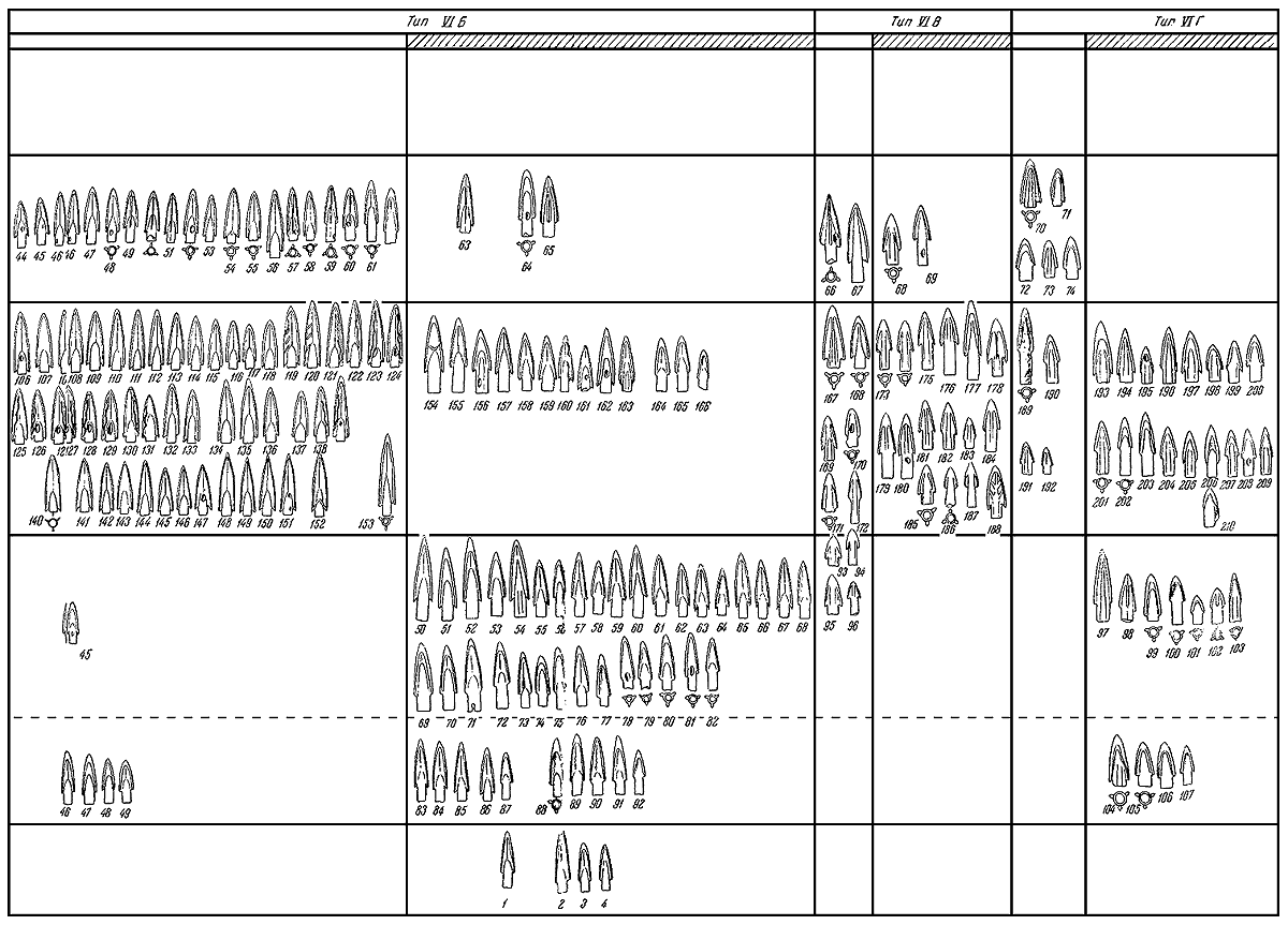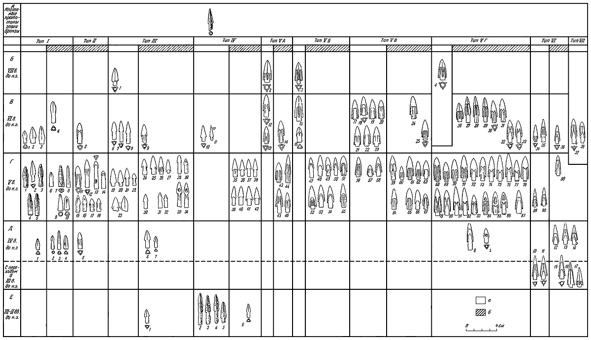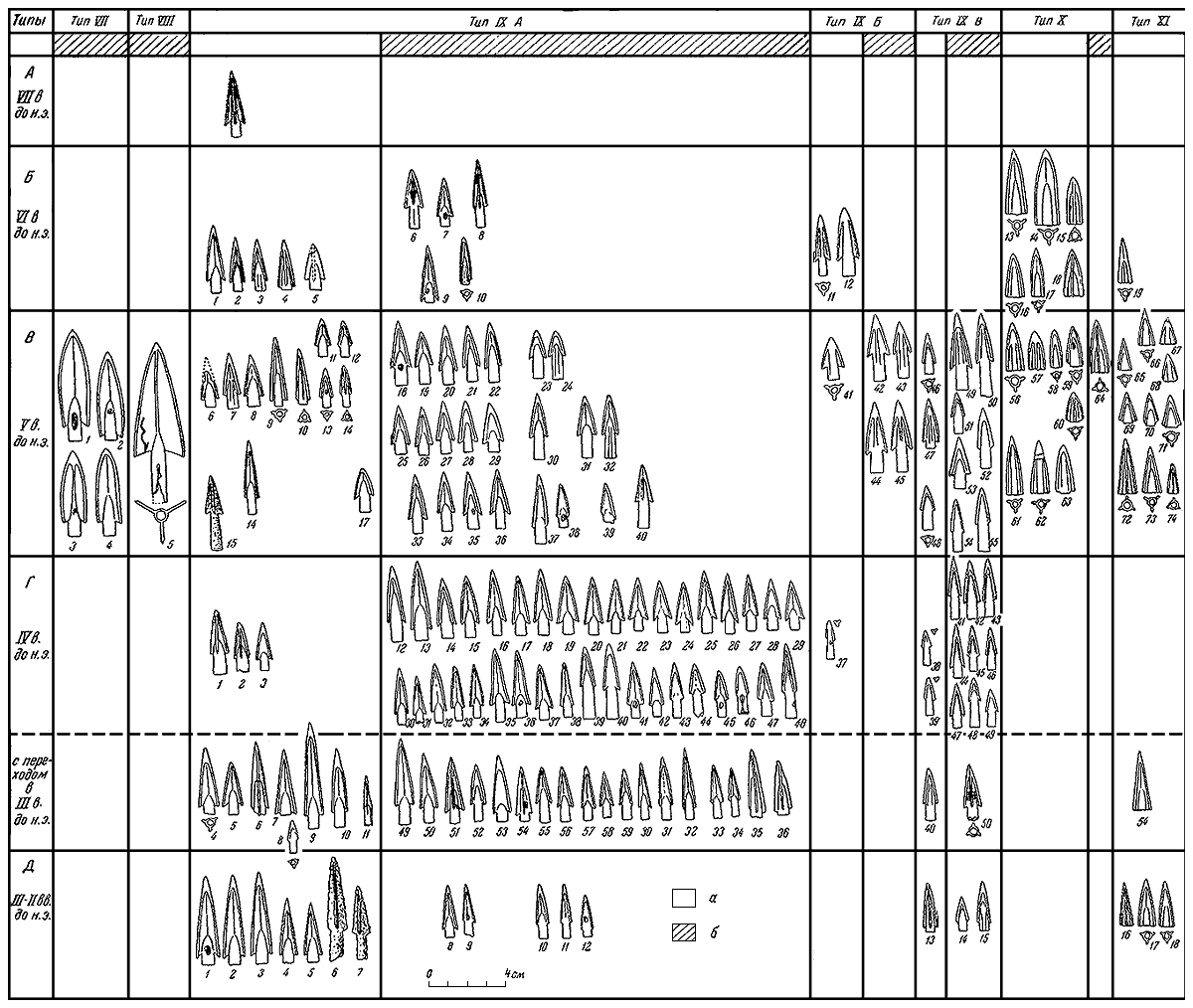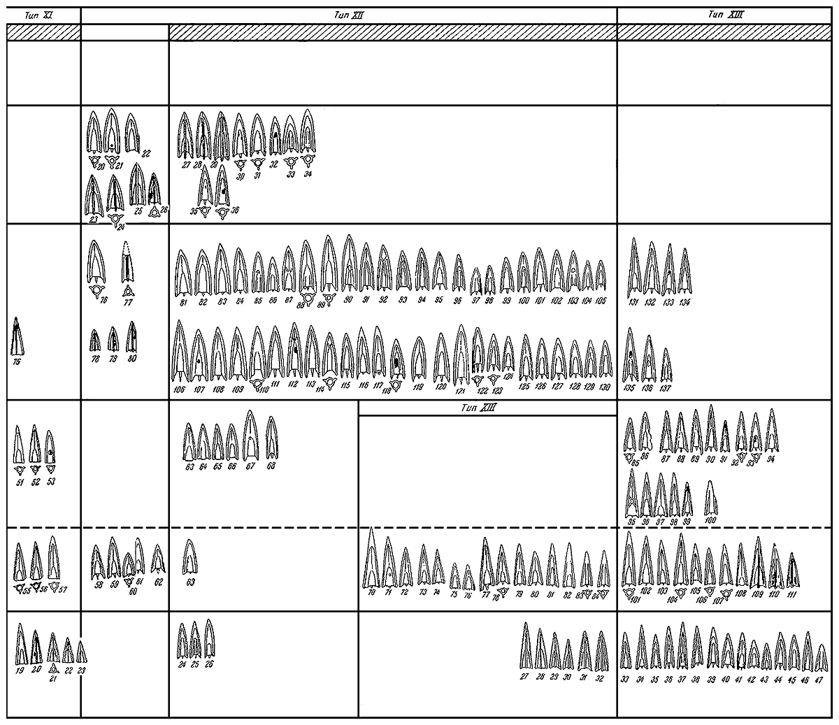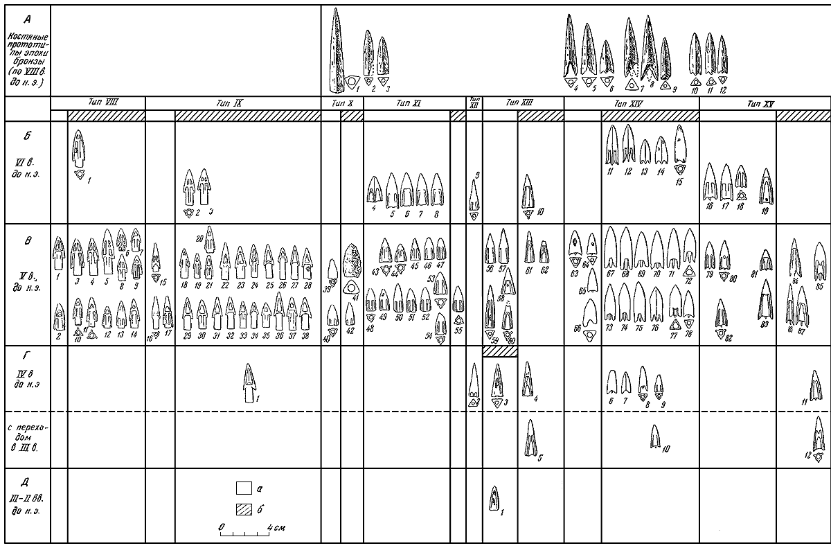 Таблица V. Втульчатые трехгранные стрелы савроматов и сарматов Поволжья и Южного Приуралья (в тексте типы обозначены арабскими цифрами).