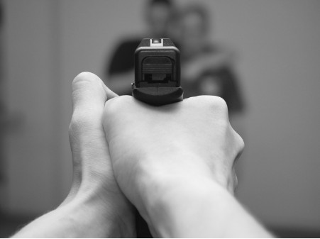 Фото 44. На расстоянии более 7 м от преступника или когда тот прикрывается заложником, стрелок фокусирует зрение на совмещении прицельных приспособлений, при этом мишень будет видна нечетко. В данной ситуации спусковой крючок обрабатывается аккуратно и мягко