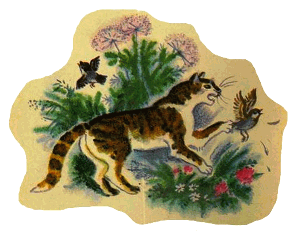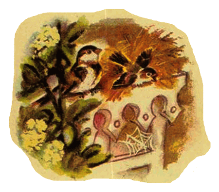 Эх, бескрылый человек, У тебя две ножки, Хоть и очень ты велик, Едят тебя мошки! А я маленький совсем, Зато сам мошек ем.Пел, пел да и вывалился из гнезда, а воробьиха за ним, а кошка — рыжая, зелёные глаза — тут как тут.