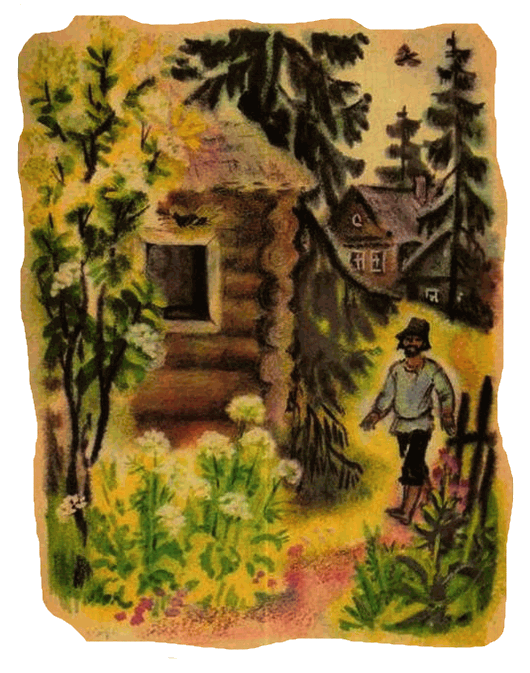 Повёл его к себе в берлогу. Иванушка идёт, дверью за сосны задевает.