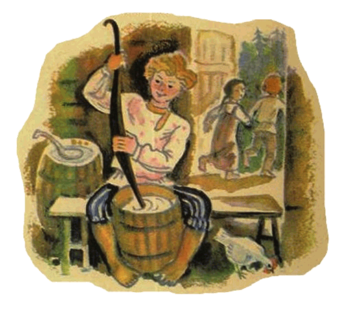 Посидели дети некоторое время на полу — запросили есть; Иванушка втащил в избу кадку воды, насыпал в неё полмешка муки, меру картошки, разболтал всё коромыслом и думает вслух: