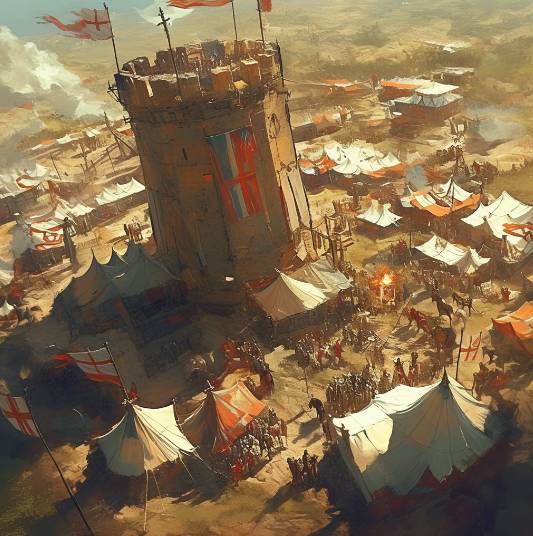 Жизнь в лагере вокруг кипит, воины готовят еду на кострах, ухаживают за снаряжением и лошадьми, а вдалеке я даже вижу цех под открытым небом, где собирают осадные орудия.