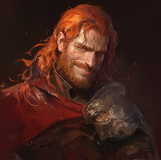 Я вхожу в комнату на третьем этаже с широким столом, на котором расположена карта боевых действий и расставлены драгоценные камни и фигурки. У бойницы стоит высокий человек с огненными волосами и алым плащом, который разворачивается, услышав нас.