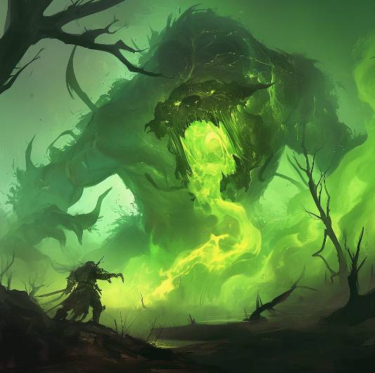 Теперь всё вокруг покрыто светящимся зеленым облаком. Не будь вокруг меня защиты, то я был бы уже мертв, но кроме ядовито-химических свойств вроде ничего больше нет. Это явно не драконье пламя, хотя без защиты оба варианта принесут мучительную смерть. Я продолжаю стоять на месте и прикидываю, что стрелять или резать такого большого монстра будет хлопотно, поэтому появляется желание проверить кое-что новое.