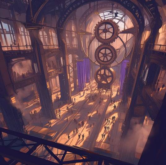Металлические колонны поддерживают высокий потолок, а вдалеке видны три огромные шестерни, стоящие одна над другой. Наверное, какая-то инсталляция, ведь остаются неподвижными. Куратор ведет нас по этажу в сторону местного бюро восходителей, как он это называет. Фактически это очень похоже на стойку координатора фей в Кодэн Хошт, только здесь полузакрытые кабинки, где за стеклом находится мехалит, к которому можно обратиться по любому вопросу, связанному с главным квестом.