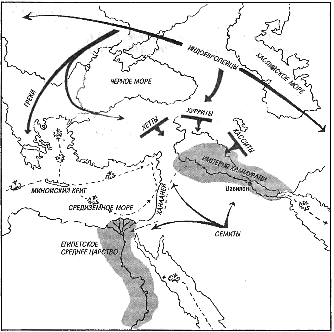 империя Митанни в долине верхнего течения Евфрата управлялись царями, которые поклонялись богам с индоевропейскими именами. Менее бесспорны свидетельства присутствия индоевропейских племен среди гиксосов. В общем, индоевропейцы, похоже, были немногочисленны. Как тонкий правящий слой они быстро приняли языки своих союзников — хурритов, касситов или семитов. Вследствие этого сохранились только слабые следы их языковой самобытности [187] .187