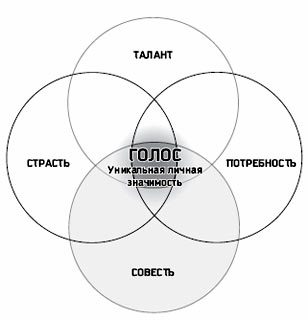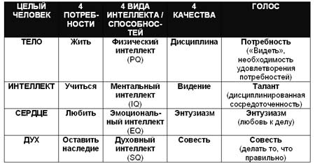 Хочу еще раз напомнить простую систему представлений о жизни: целый человек (тело, разум, сердце и дух), обладающий четырьмя основными потребностями (жить, учиться, любить, оставить после себя наследие) и четырьмя видами интеллекта или способностей (физический, ментальный, эмоциональный и духовный) в их наивысших проявлениях (дисциплина, видение, страсть, совесть). При этом все названные категории представляют четыре измерения голоса (потребность, талант, страсть и совесть).