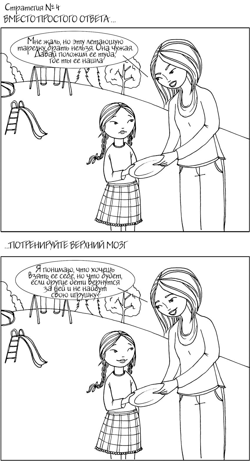 Даже маленькие дети обладают способностью остановиться и подумать, вместо того чтобы бить кого-то кулаками или обижать словами. Они не всегда будут принимать правильные решения, но чем больше будут упражняться в рассмотрении альтернатив всевозможным выпадам, тем более сильным будет становиться их верхний мозг.