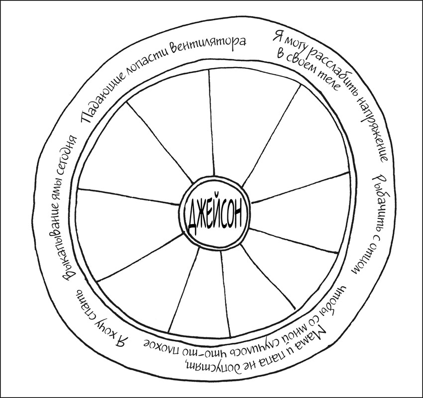 Затем Джейсон мог предпринять следующие шаги, позволяющие соединить различные аспекты его психики. Сосредоточиться на других точках обода колеса: на своей уверенности в том, что родители оберегают его и они никогда бы не позволили ему спать под вентилятором, который рискует упасть и поранить его. Или, скажем, вспомнить, сколько удовольствия он получил в тот день, выкапывая огромную яму на заднем дворе. Или сконцентрироваться на напряжении, которое он ощущает в своем теле, и использовать некоторые управляемые психические образы, чтобы расслабиться. Джейсон любит рыбачить, поэтому он научился представлять себя в лодке с отцом (мы более подробно расскажем об этой методике через минуту).