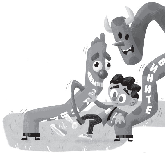 Обе надувные фигуры с ухмылкой наклонились над ним. Длинные извивающиеся руки метнулись к нему и схватили за куртку. Александр пытался отпихнуть их, но зелёный верзила обвился рукой вокруг его лодыжки. Пока мальчик пытался освободиться, с него слетел ботинок.