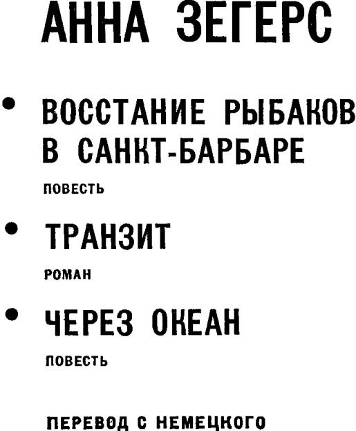 Однако наряду с произведениями широкого эпического охвата, где жизнь Германии предстает в разных социальных разрезах, у Анны Зегерс есть вещи и более частного плана: общественные конфликты нашей эпохи присутствуют и в них, но развертываются на сравнительно небольшом плацдарме. Повесть «Восстание рыбаков в Санкт-Барбаре» (1928), небольшой лирический роман «Транзит» (1943), повесть-притча «Через океан» (1971) — книги, написанные в разные периоды жизни автора, очень несхожие по сюжетам и манере письма, характерны для разных этапов и сторон творческого пути Зегерс. И в каждой из них сказываются самые коренные свойства мудрого, гуманного таланта писательницы-коммунистки.