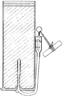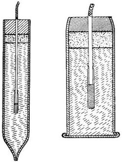 Буровая пироксилиновая шашка во избежание смещения со своего места, по препровожденному краткому описанию припаивается к жестяному полому цилиндру, что едва ли можно признать безопасным, так как при этом могут иметь место нечаянные взрывы.