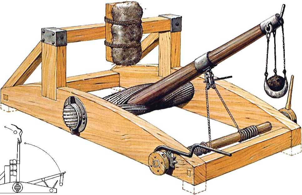 рошо виден курковый механизм орудия, по спуску приходилось ударять молотом, чтобы гарантировать удачный выстрел. Орудие должно было твердо стоять на земляной или кир-оичной платформе. Его никак нельзя было установить на стене из-за сильной отдачи, способной вызвать разрушительную вибрацию. По сравнению с хейробаллистрами и скорпионами, конструкция этой катапульты проста, кроме того, она не требует особой настройки. С другой стороны, такое орудие плоко приспособлено