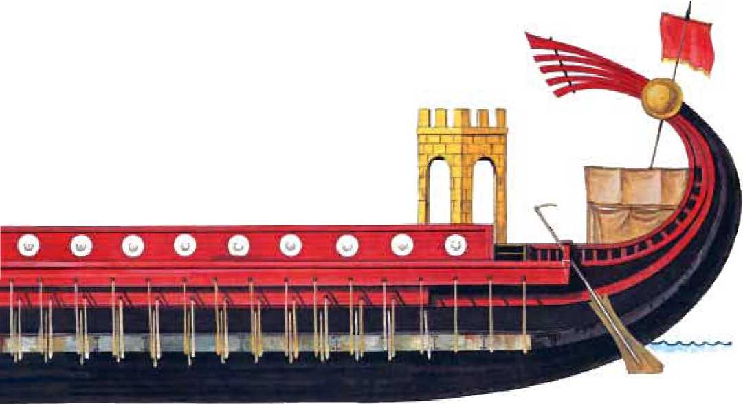 мы видим, что более легкие суда вновь стали полноценными боевыми кораблями и что тактика маневра и тарана применялась против более тяжелых кораблей, что дало возможность брать их на абордаж. Страте! ичсскн легкий корабль. более подвластный ветру и погоде, оставался в проигрыше. Однако при определенных прибрежных операциях такие корабли часто доказывали свою ценность. Когда битва шла при легком волнении, такой корабль поднимался на вершимы волн и был более маневренным. Секст продемонстрировал это сшсдо Филипп. Если корабль зацепляли абордажными крюками, команда могла легко покинуть судно, броенв-