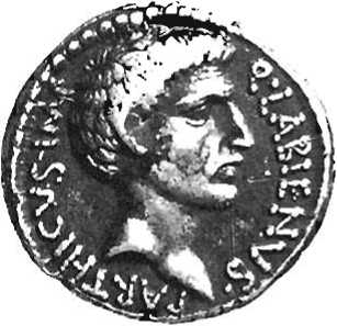 (наверху). На монете изображена голова Квинта Лабиена. Примечательно, что он изображен ссбн в «парфянском» стиле.