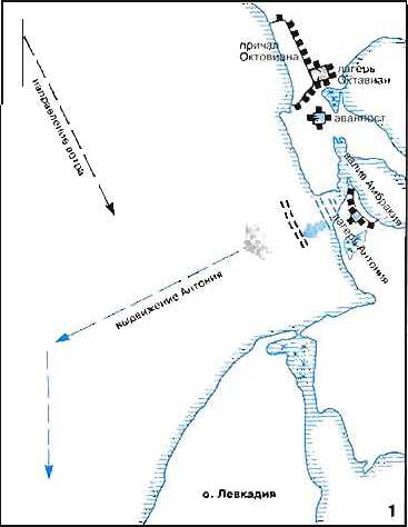 1 Чтобы добиться некоторого преимущества при северо-западных ветрах и обойти остров Левкадия, Антоний должен выбрать удачный момент для выхода в море. Он отправляется в путь с убранными парусами - тактика, характеризующая Антония скорее как труса, выбирающего бегство, чем воина, способного драться до последнего (?). Три его эскадры выстраиваются в два ряда, вперемешку с транспортными судами - для маскировки. Корабли Клеопатры следуют за ними. Корабли Октавиэна тоже выстроены в два рада и ждут, опасаясь быть прижатыми к берегу.