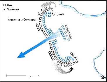 2 Антоний выходит в наступление в полдень, левым крылом вперед, надеясь оттеснить Ок-тавиана назад и таким образом открыть путь на юг. Октаеиан отводит свои корабли назад, заманивая флот Антония в открытое море, где его поджидают ударные силы флота Октааиа-на. Флотилии сходятся, снаряды тучами летят с обеих сторон. Агриппа растягивает вторую линию своего флота на север и на юг, в ответ на это Антоний отводит часть