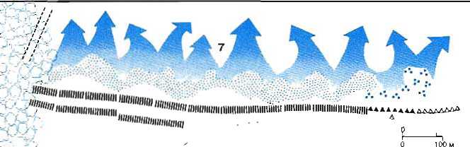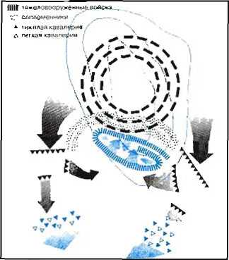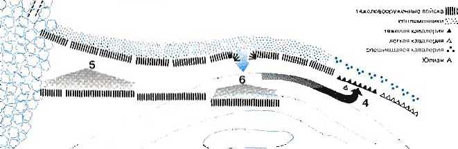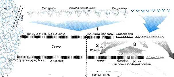 1 Атака германцев вызывает панику в рядах римской кавалерии, потому что во время битвы погибает предводитель клибзнэриев (2). Левый фланг римского войска твердо держит свои позиции. Ба-тавы и гвардия атакуют, поддерживая корнутов и брахиатов (солдат римской армии) (3). Клибанари-ям некуда отступать: позади них разворачивается легион. Юлиан ведет их в атаку (4). Левый фланг римлян выдвигается вперед (5). Под предводительством нескольких вождей германцы прорывают центр римского войска (6). Их останавливает легион приманов и оттесняет назад. Римляне про