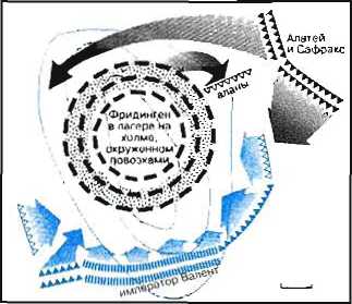 кавалерии правого фланга. Остготские всадники находятся вне лагеря, занимаясь фуражировкой. Фриди-герн (один из вождей готов) поджигает траву на равнине и высылает послов, чтобы выиграть время. Однако римляне, уже готовые к битве, идут в атаку.1 Остроготы возвращаются, атакуют правый фланг римского войска и оттесняют назад римскую кавалерию. Равнину накрывает облако пыли. Не подозревая о происходящих справа событиях, левый фланг двигается вперед на лагерь готов.