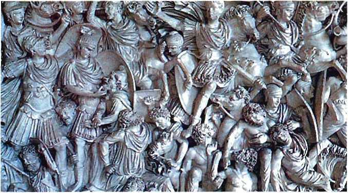 (внизу). Римляне против варваров. В последние годы Римской империи, когда бывшие кочевники практически полностью смешались с римским народом, разница между двумя паническими группами стала скорее юридической, чем этнической.