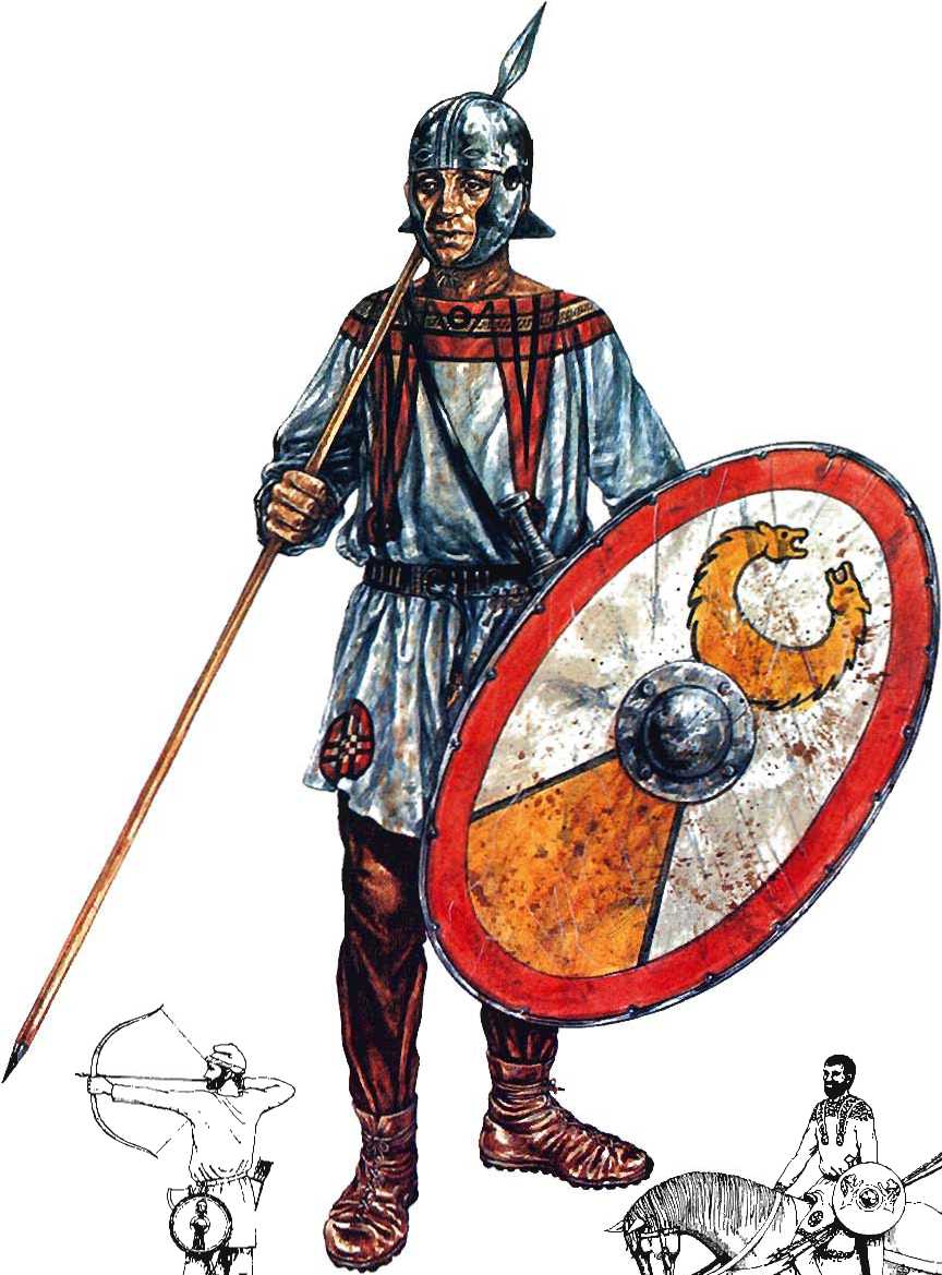 Ко времени правления Константина римская армия радикально изменилась. Старые легионы и вспомогательные войска стали теперь пограничными силами и были значительно сокращены. Наступило время элитной мобильной действующей армии. Такая армия состояла из подразделений кавалерии, называвшихся дворцовыми ве-ксиллариями, и пехотных подразделений - пяти дворцовых легионов (каждый около 1000-1500 воинов), а также дворцовых вспомогательных войск. Один из тех воинов, которых набирали в Британии в дворцовые вспомогательные войска (аихШа ра1а1шае), изображен на рисунке. Его можно отличить по особенной модели щита, описанной в армейском реестре «Нотиция Дигнита-тум». Пояс воина напоминает офицерский походный ремень наших дней, на нем имеются кольца для пристегивания разных принадлежностей. Воин имеет при себе длинный меч (слэту) и ланцу -легкое копье. Точно не установлено, какие из распространенных в то время доспехов носил такой солдат. Аммиан постоянно упоминает «сверкающие» или «сияющий доспехи». Реконструкция вооружения этого воина основана на рельефах, украшающих арку Константина.