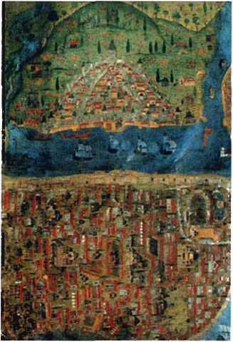 (наверху). Карта Константинополя в 1534 г. Защитные укрепления города со стороны моря и суши были фактически разрушены выстрелами турецких пушек в 1453 г.